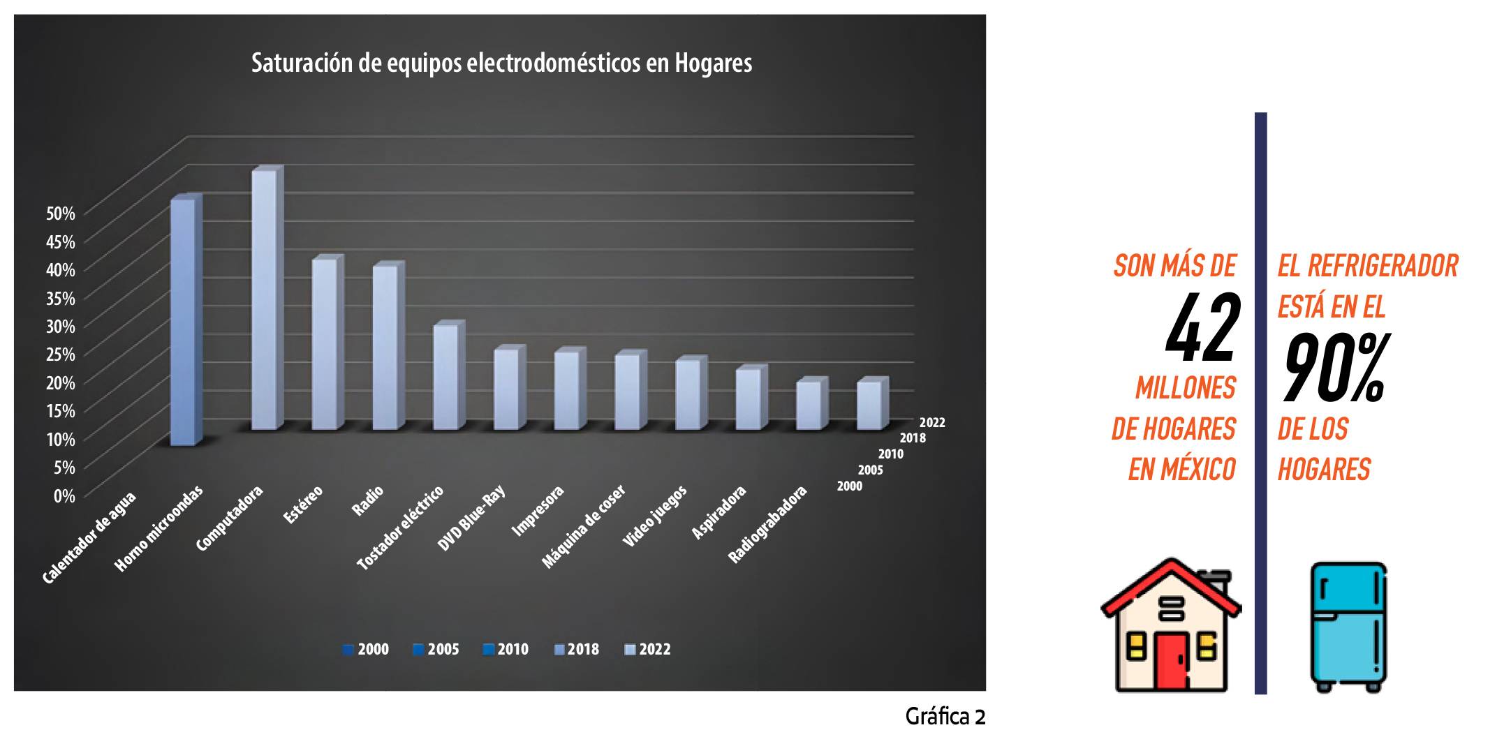 En la gráfica 1, se observa que casi todos los equipos han tenido un crecimiento sostenido a lo largo del tiempo. Por ejemplo, los refrigeradores pasaron de un 69% de saturación en casa habitación en el año 2000 a un 89% en la última encuesta reportada por INEGI en 2022, lo que representa un total de 38 millones de refrigeradores en funcionamiento diario.