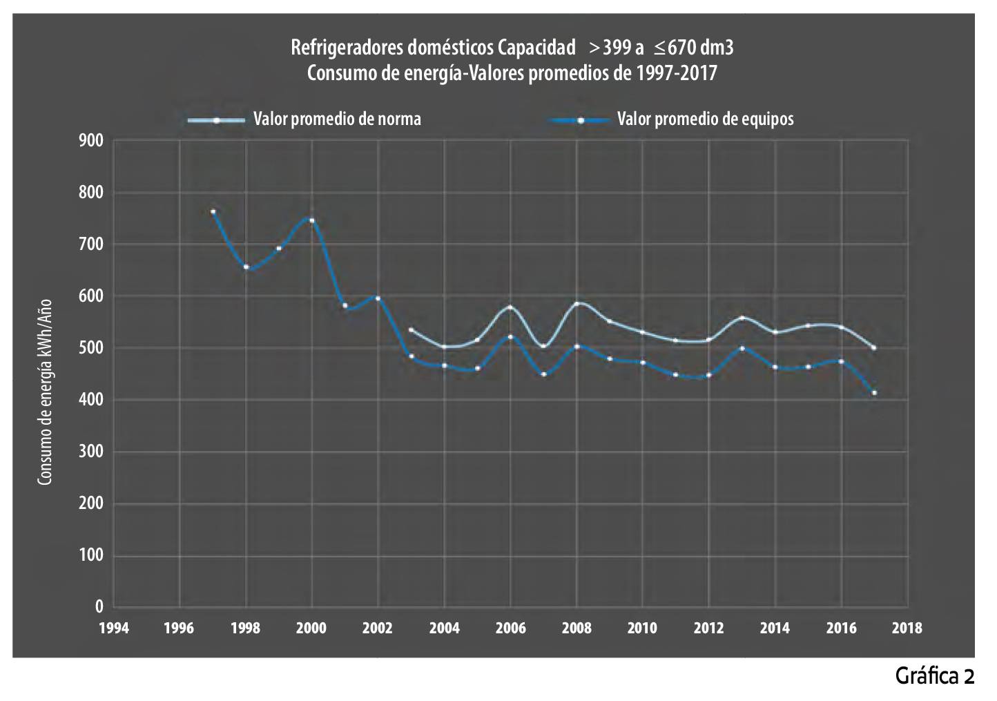 Por ejemplo, en la gráfica 3 se puede observar que el consumo de los refrigeradores ha tenido un descenso sostenido a lo largo del tiempo. Sin embargo, también se aprecia que, aunque la norma nacional de eficiencia energética establece valores máximos de consumo, los fabricantes no sólo se conforman con cumplirla, sino que superan los valores normalizados en un 11%.